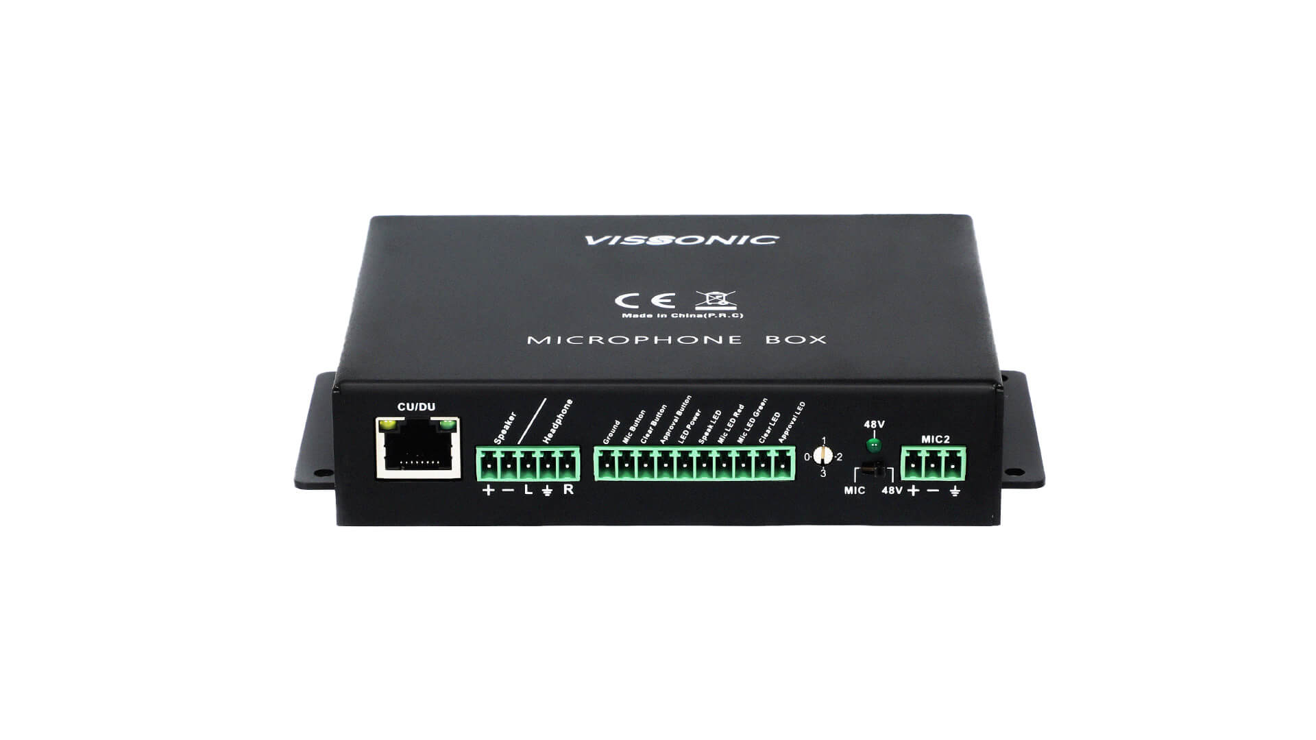 The VIS-AIB microphone interface box is designed to support VISSONIC conference microphone remotely installed under the table or armrest solution. With the phoenix connectors on both sides of the box, it can connect Dynamic mic/Boundary Condenser mic input, buttons and speakers on plate to control the conference unit etc. By the RJ45 port it can easily connect into existing VISSONIC conference microphone family to integrated into one part seamlessly.