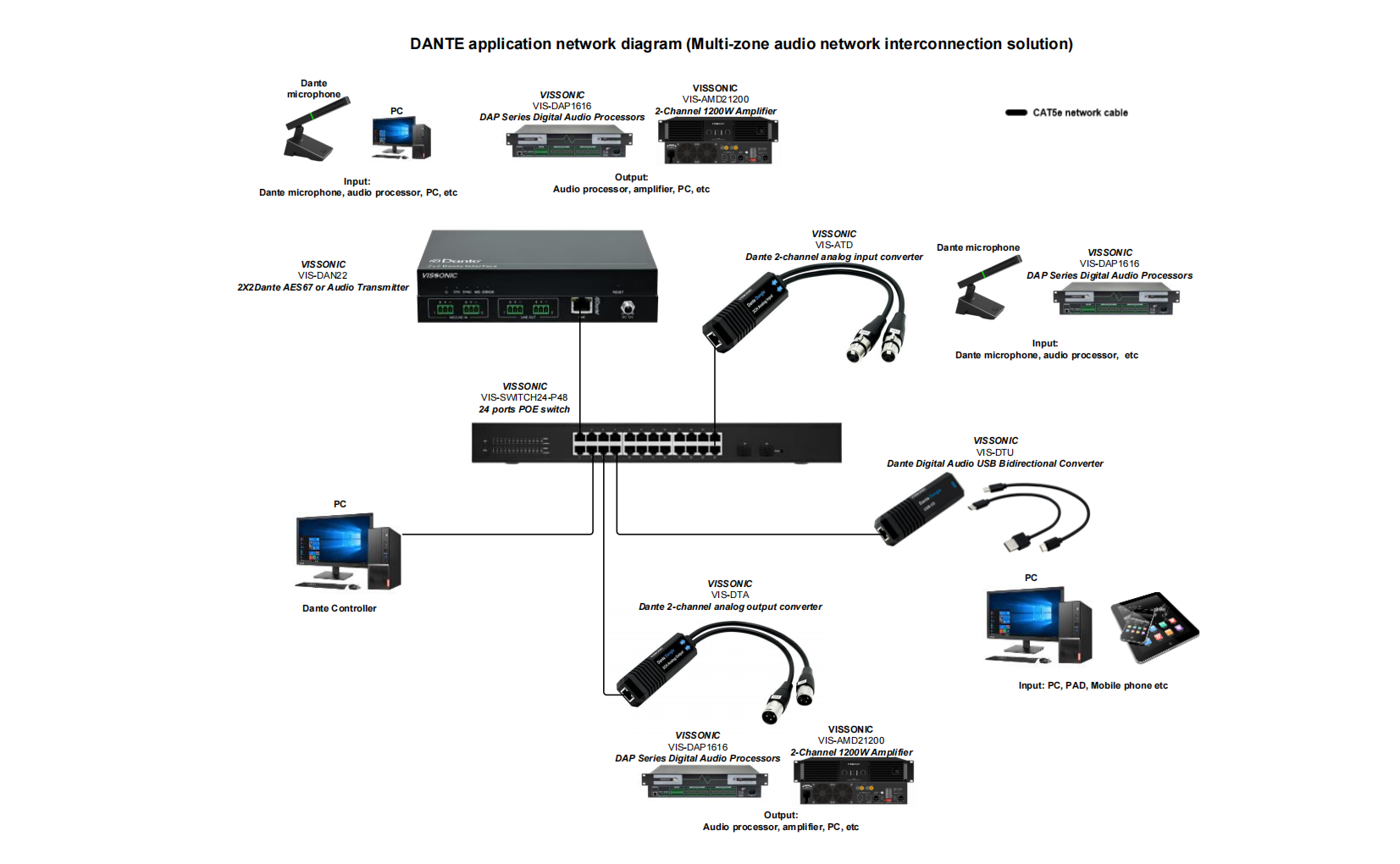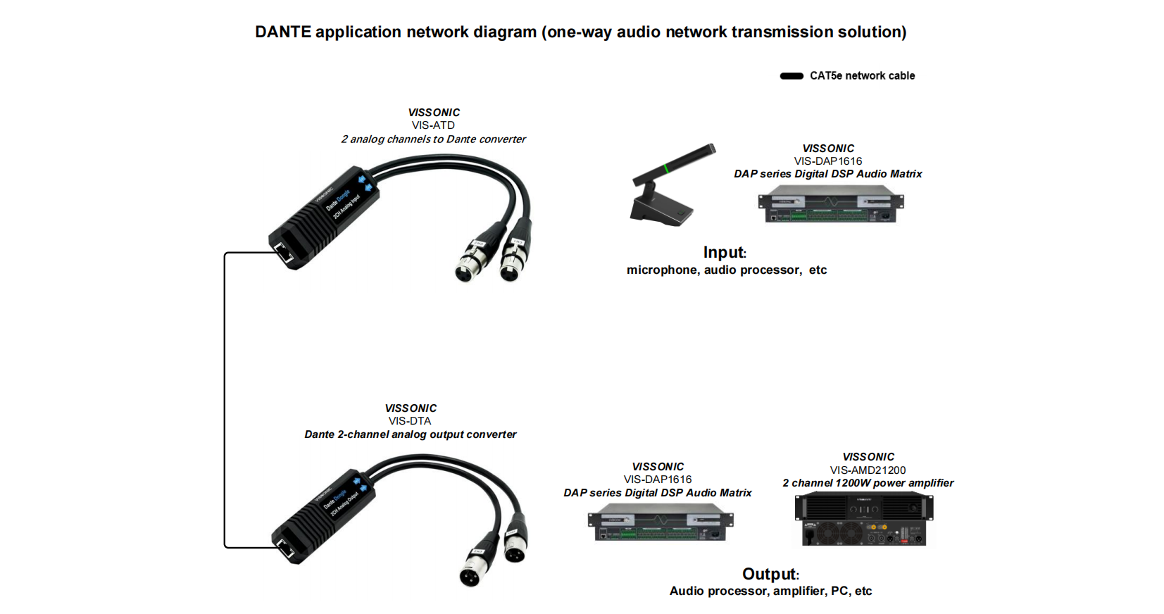 VIS-ATD can convert two independent analog audio channels into Dante digital audio signals. This function enables analog audio sources, such as analog microphones, analog mixers, etc., to be seamlessly connected to the Dante audio network. The converter is fully compatible with the Dante audio transmission protocol, ensuring high quality and low latency of audio signals during transmission. Once connected to the Dante network, VIS-ATD22 can act as a node in the network to transmit and receive audio signals with other Dante devices.