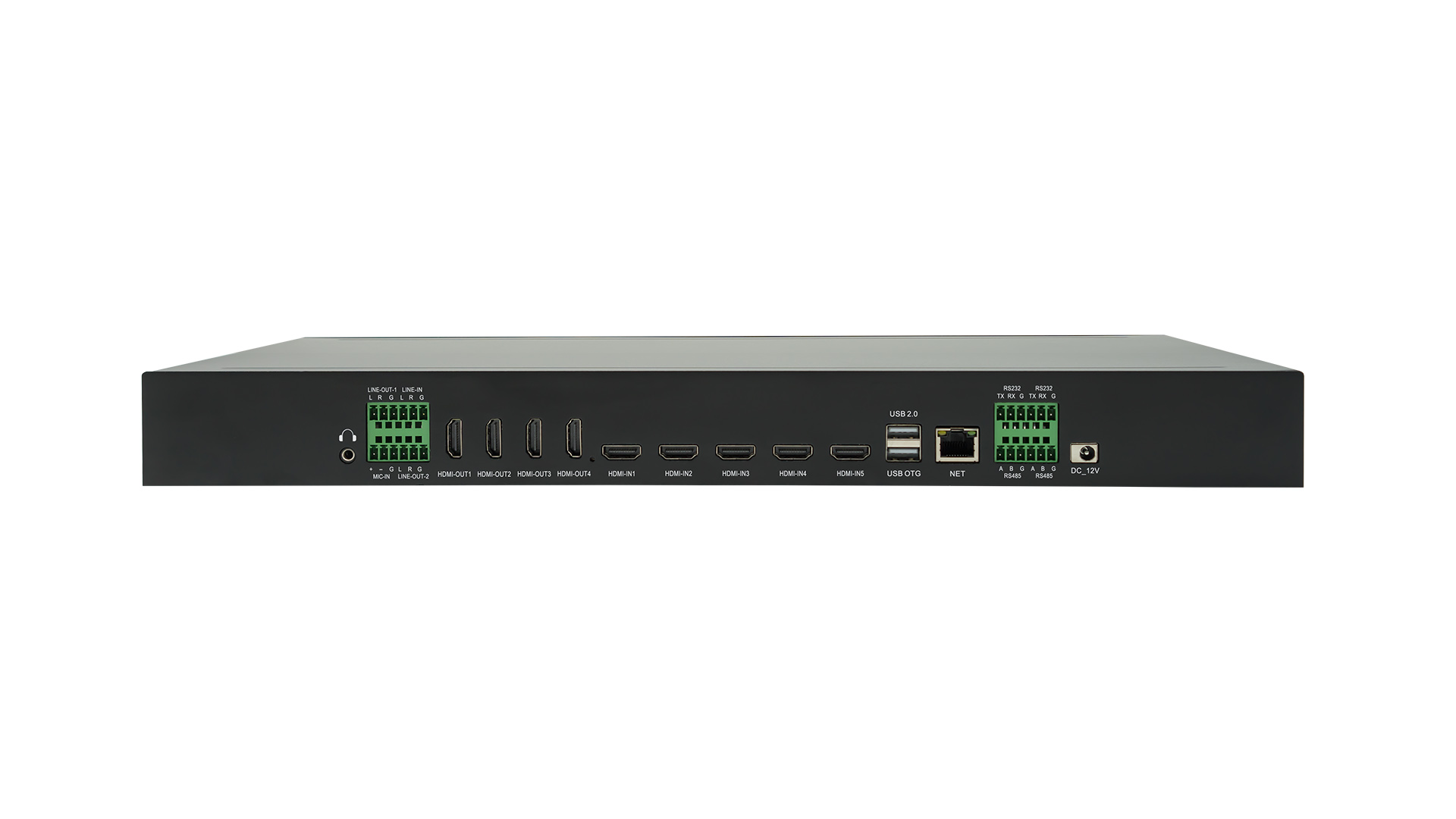 ● Up to 5 HDMI inputs and 4 HDMI outputs. HDMI output video conference screen.
