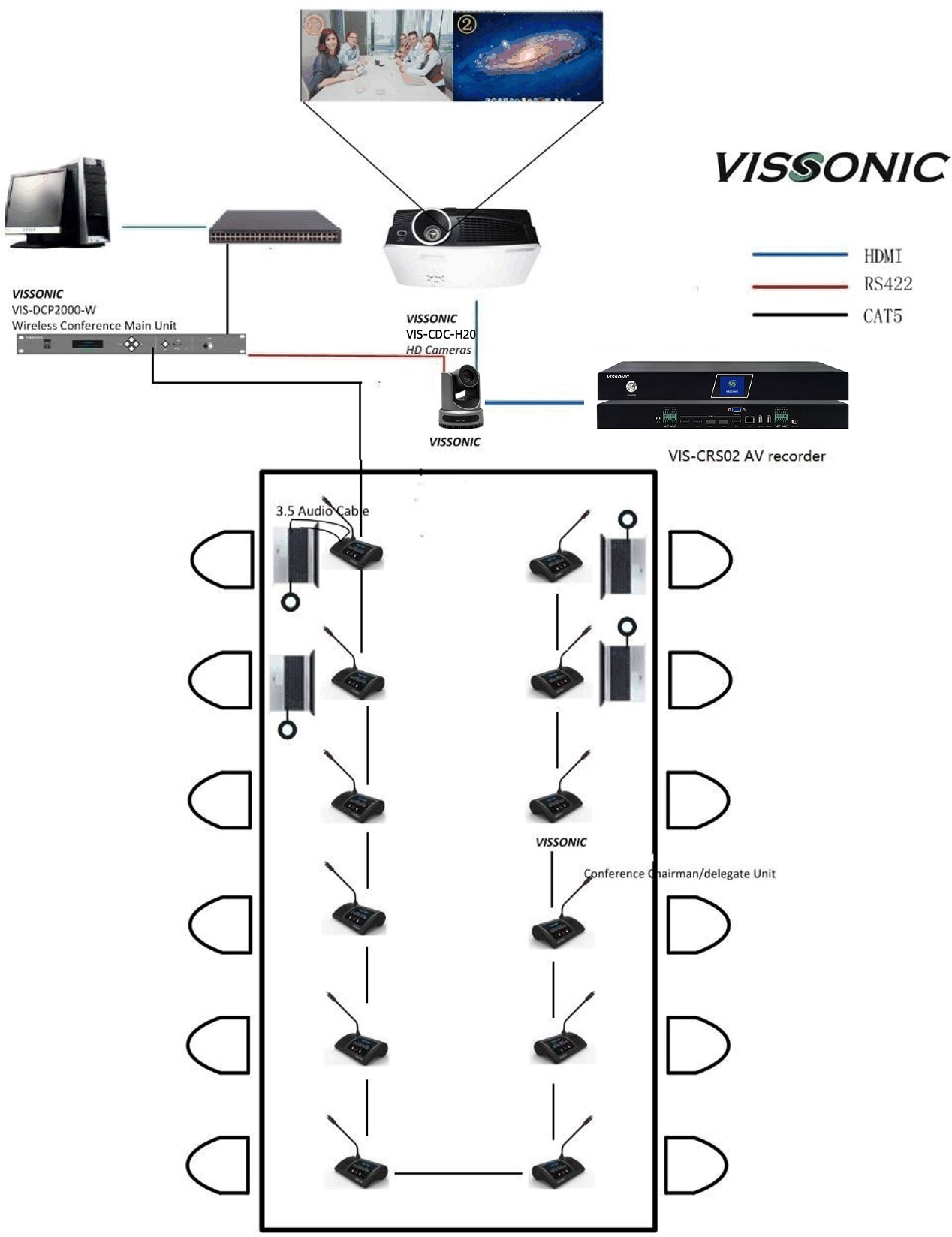 ● Working with conference controller DCP2000 to get the camera auto-tracking and recording system.