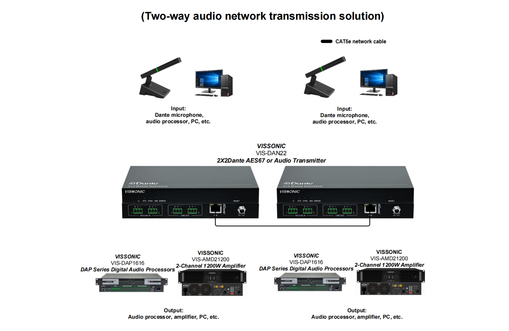 The VIS-DAN22 is a Dante network audio interface that seamlessly integrates 2x2 Dante audio channels into networked audio systems. Each input channel is equipped with a 48V phantom power option. It supports PoE power supply and features a compact design, making it easy to deploy Dante connectivity wherever it is needed.