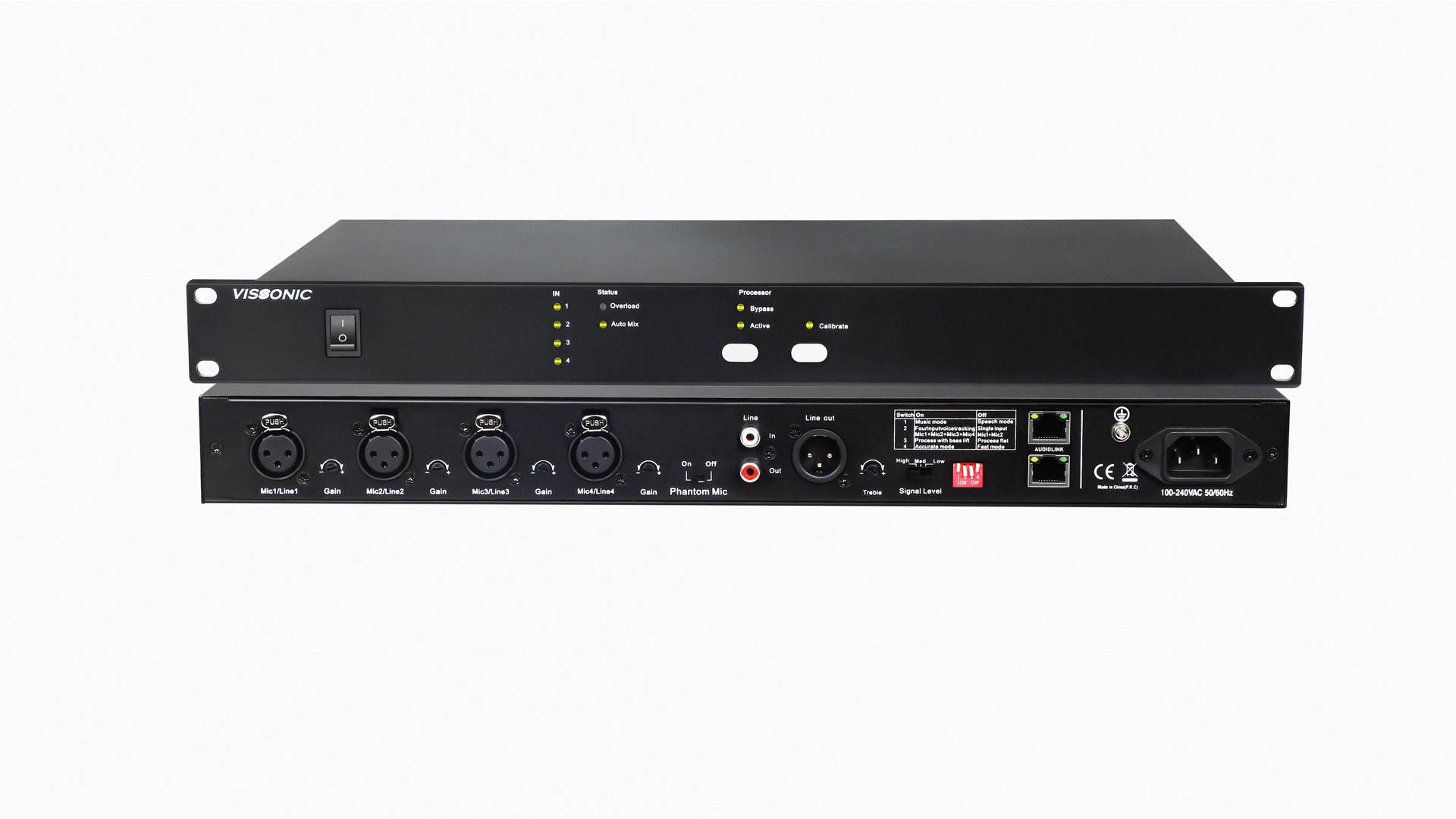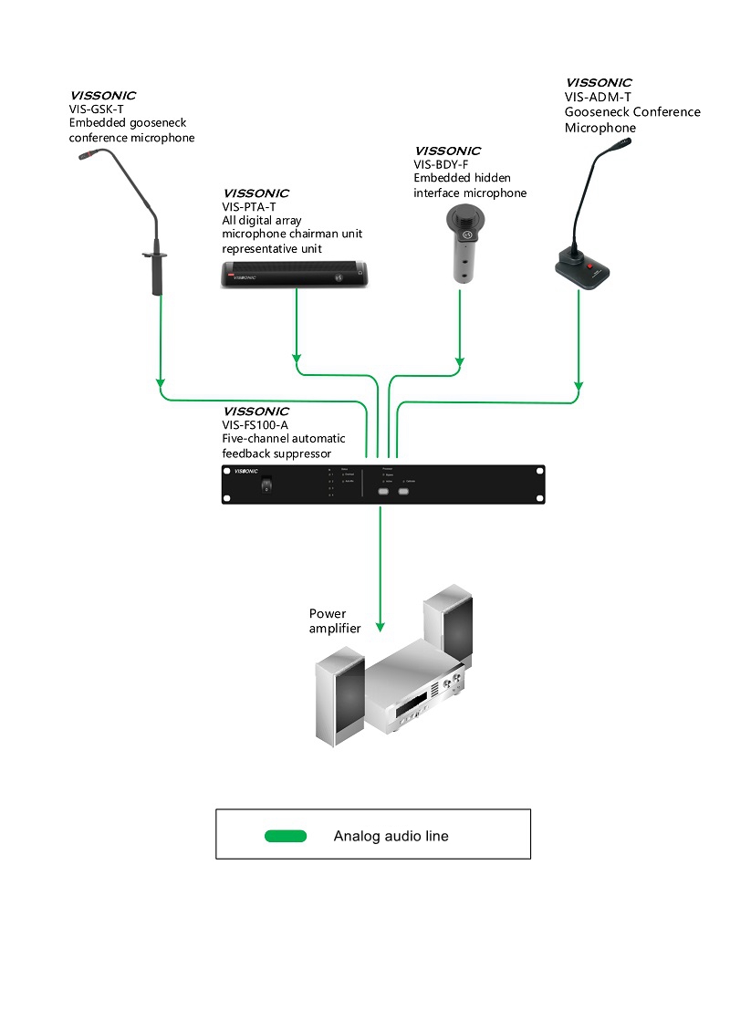 VIS-FS100-A feedback suppressor uses a powerful signal processor and a fully automatic adaptive algorithm, which is easy to use. In addition to supporting 4-line / microphone input, it is also equipped with an AUDIOLINK digital audio cascade interface and supports 5 channel automatic mixer.