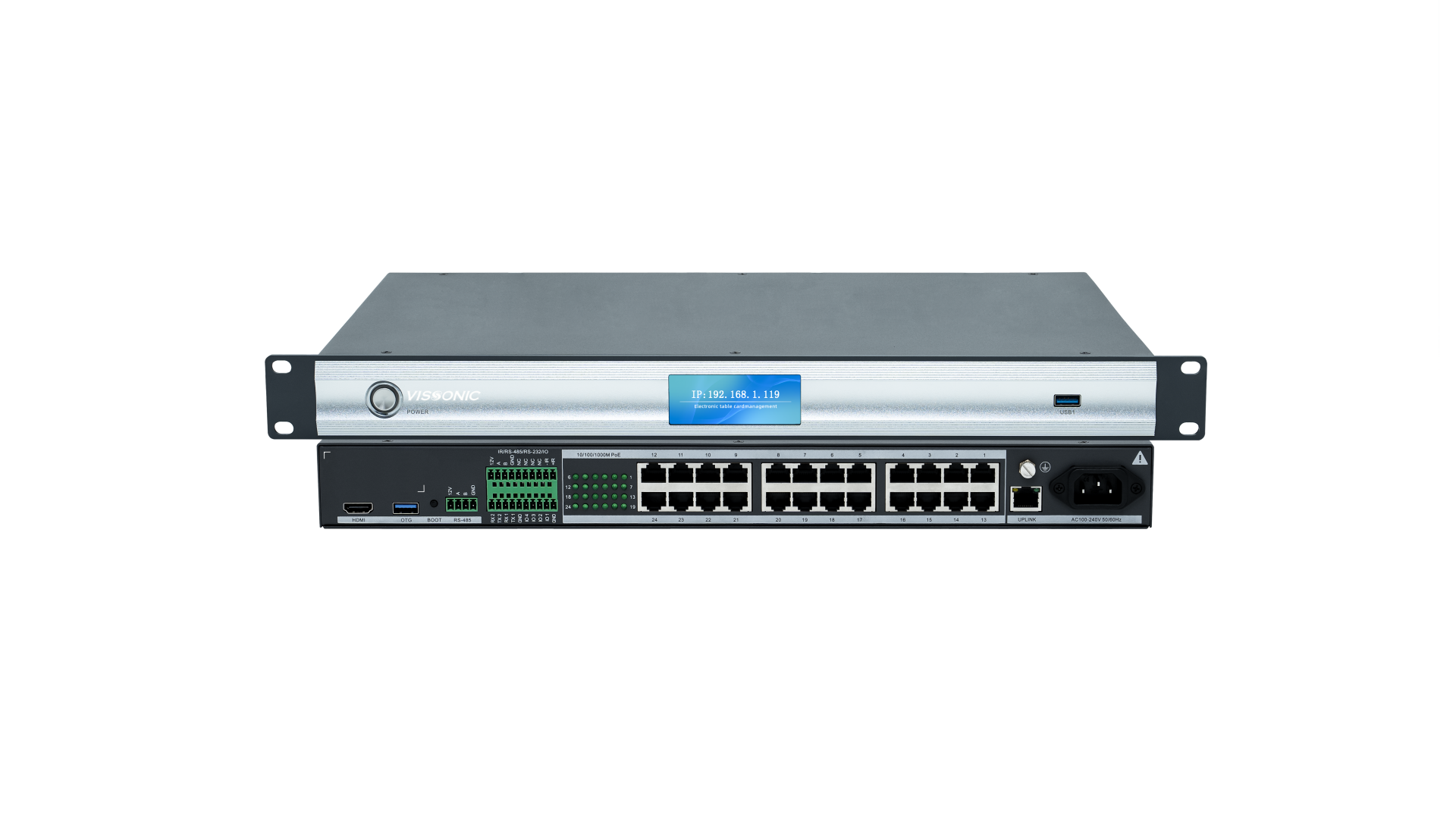 The VISSIONIC conference controller can be controlled by the VISSIONIC conference software through the LAN, enabling unit and electronic nameplate control. Each individual unit supports POE from 1 to 24 bits, and the number and scope of usage can be expanded through POE switch expansion.