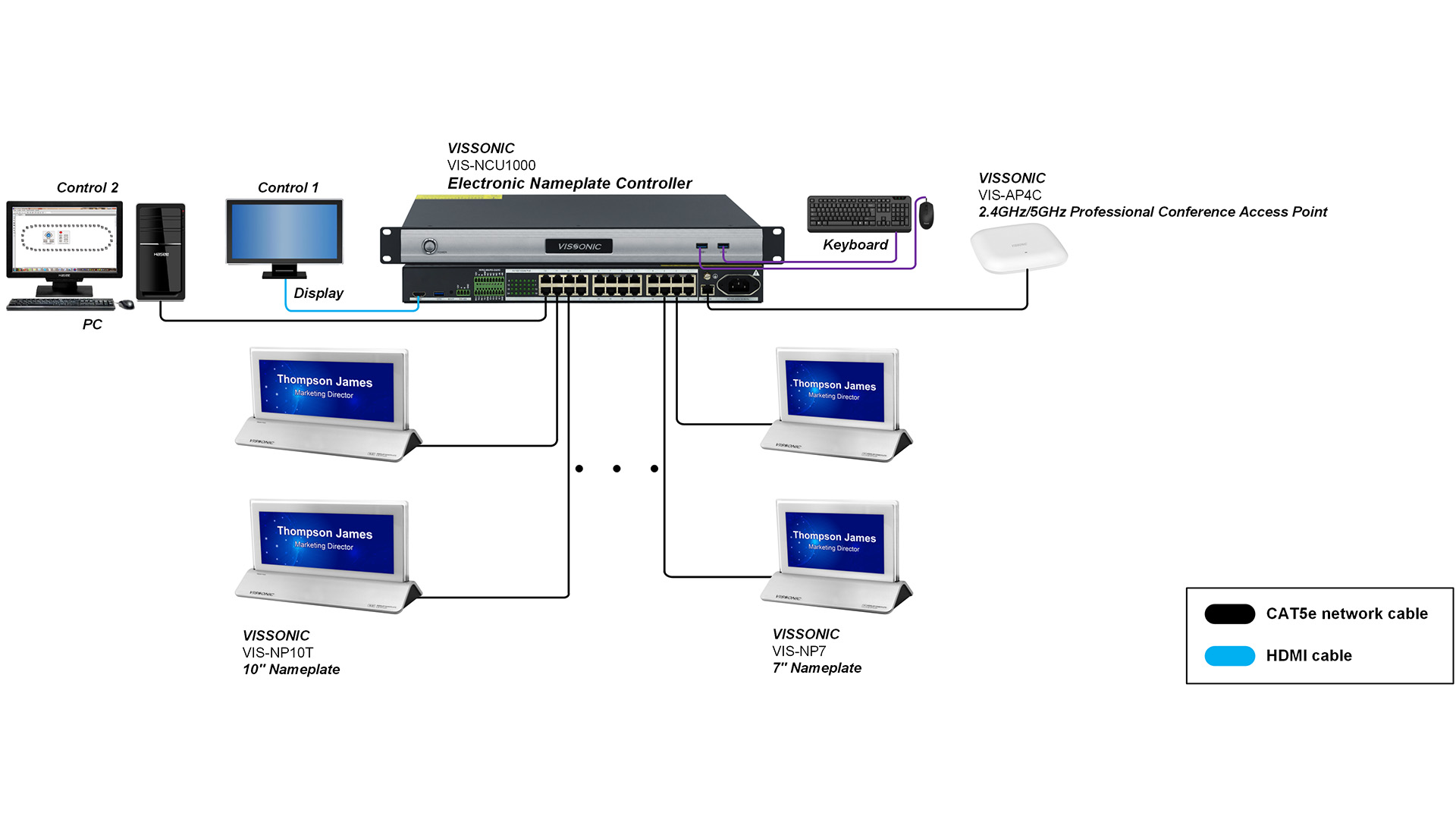 The VISSIONIC management software is installed on the nameplate controller, allowing for local operation through the keyboard. Through the conference controller, the software enables control over the conference units, electronic nameplates, and voting units via the LAN. Additionally, you can also use the VISSIONIC management software to set advanced functions, manage conference discussions, manage recordings, and so on.