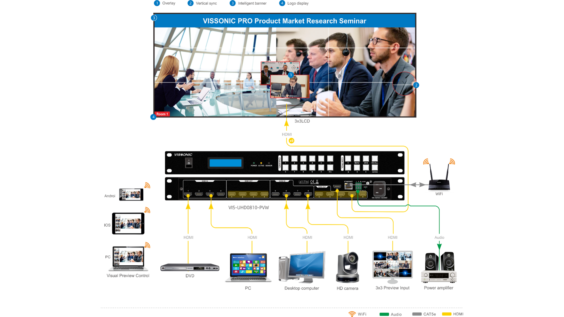 ● Seamless LED/LCD video wall processing with sync display.