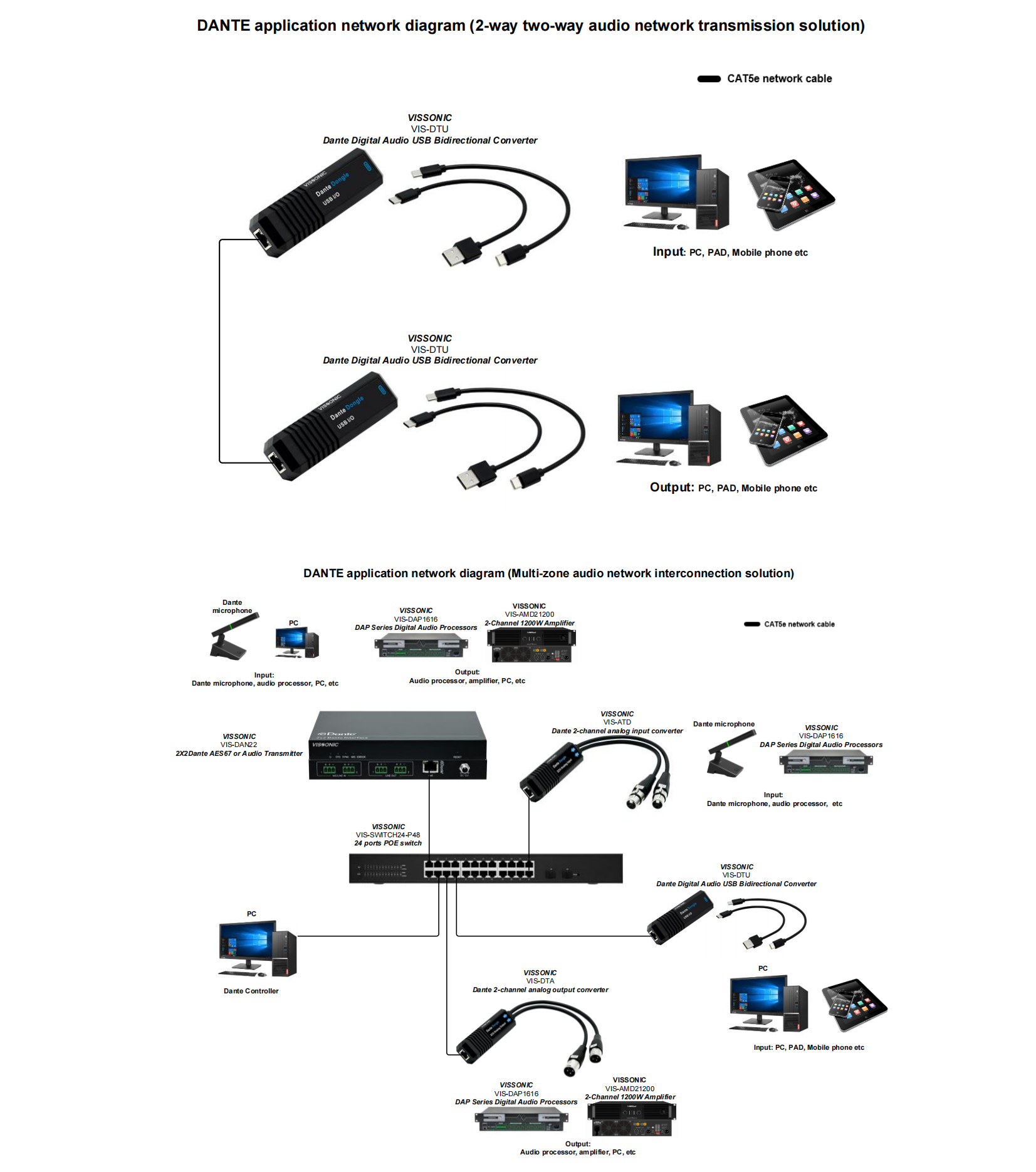 VIS-DTU achieves 2x1 channel bidirectional audio transmission capability by connecting to your Dante network. This feature allows your PC (personal computer) and mobile devices (such as smartphones or tablets) to seamlessly play and receive audio with Dante devices through USB-A or USB-C interfaces. This bidirectional audio transmission design greatly broadens the scenarios and flexibility of audio applications.