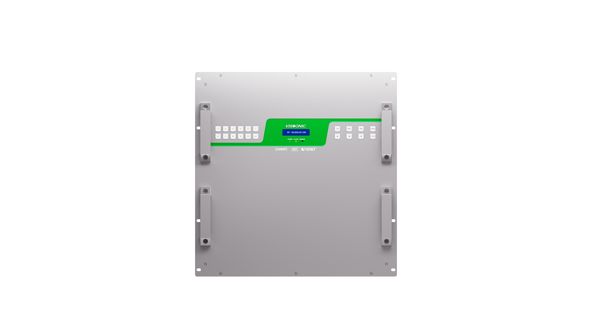 ● Front panel has LCD display and lights buttons to display and configure the device IP address.